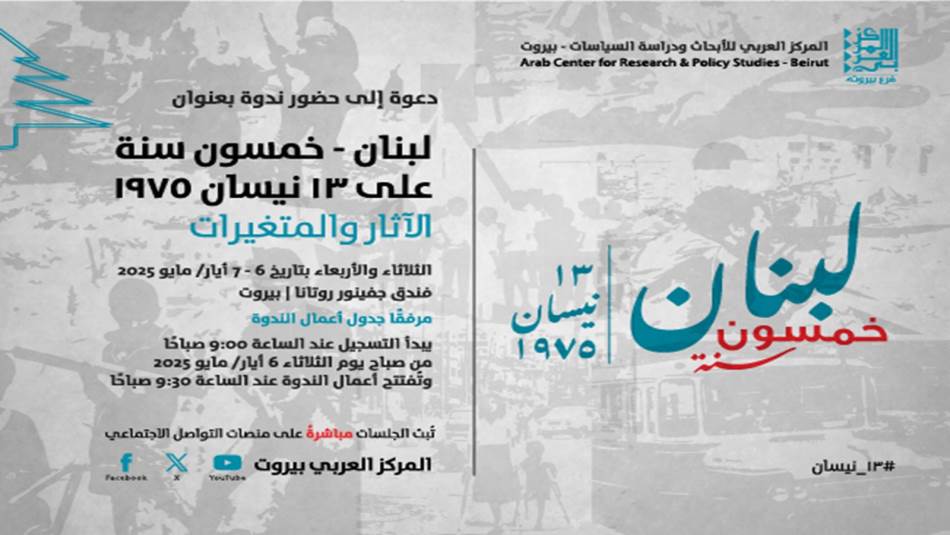 دعا المركز العربي للأبحاث ودراسة السياسيات في بيروت إلى حضور ندوة بعنوان "لبنان خمسون سنة على 13 نيسان 1975"، الثلاثاء والأربعاء بتاريخ 6 ايار 2025 في فندق جفينور روتانا بيروت. تفتتح أعمال الندوة عند التاسعة والنصف صباحاً، بمشاركة خالد زيادة، محمد أبي سمرا، صقر أبو فخر، طارق متري، علي فاعور، حلا نوفل، زهير هواري، فارس اشتي، نجيب عيسى، بطرس لبكي، عدنان الأمين، سيمون عبد المسيح ومنذر جابر: