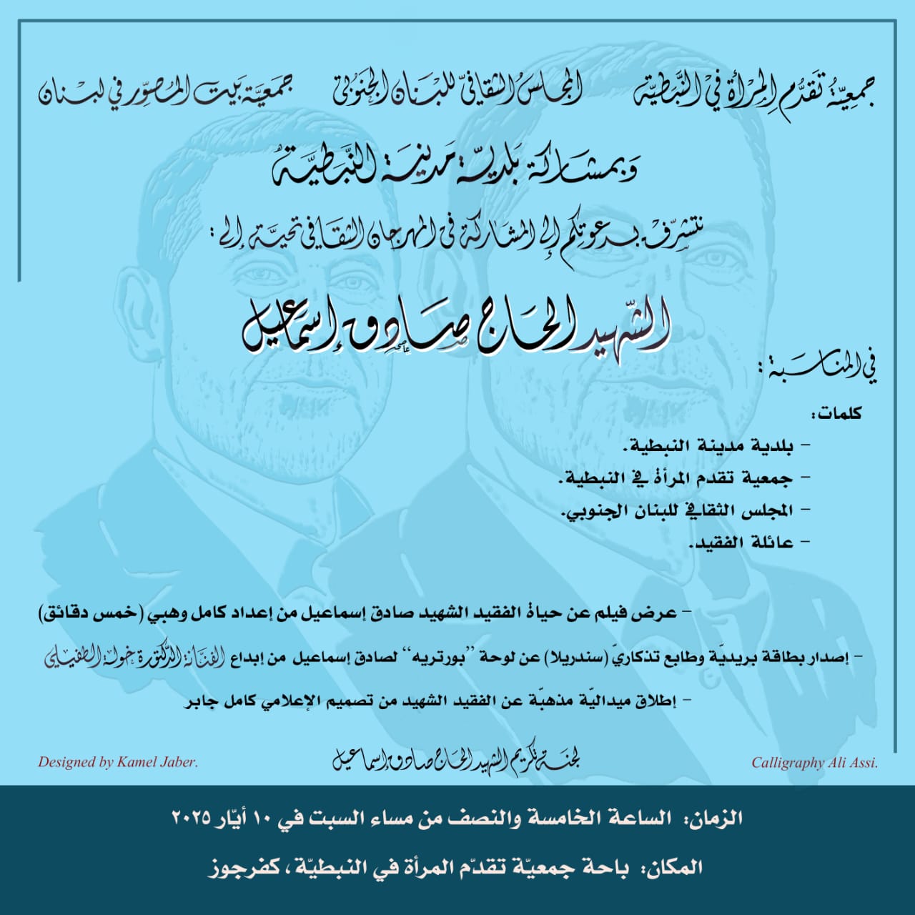دعت جمعية تقدم المرأة في النبطية والمجلس الثقافي للبنان الجنوبي وجمعية بيت المصور في لبنان، بالتعاون مع بلدية مدينة النبطية، إلى المشاركة في المهرجان الثقافي تحيةً إلى: