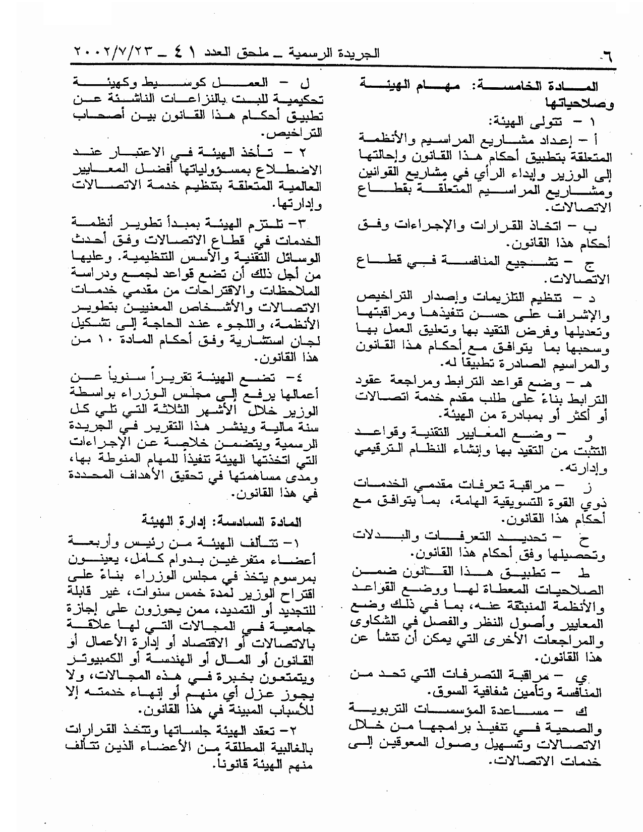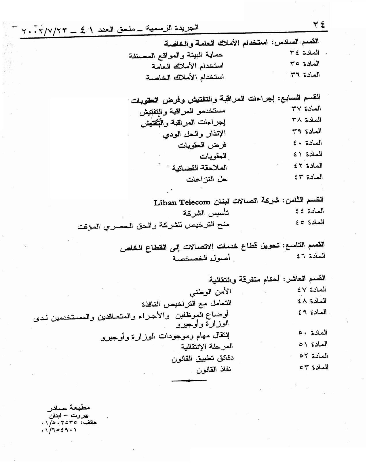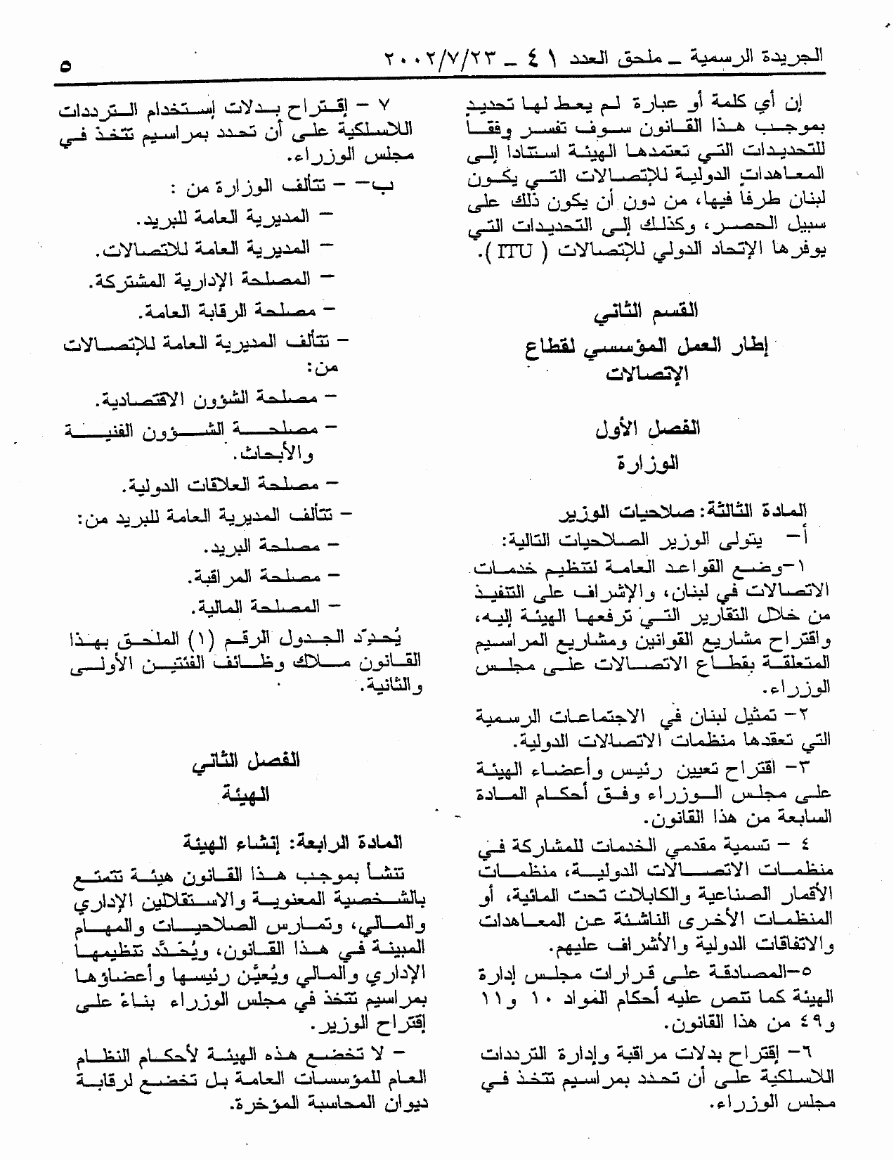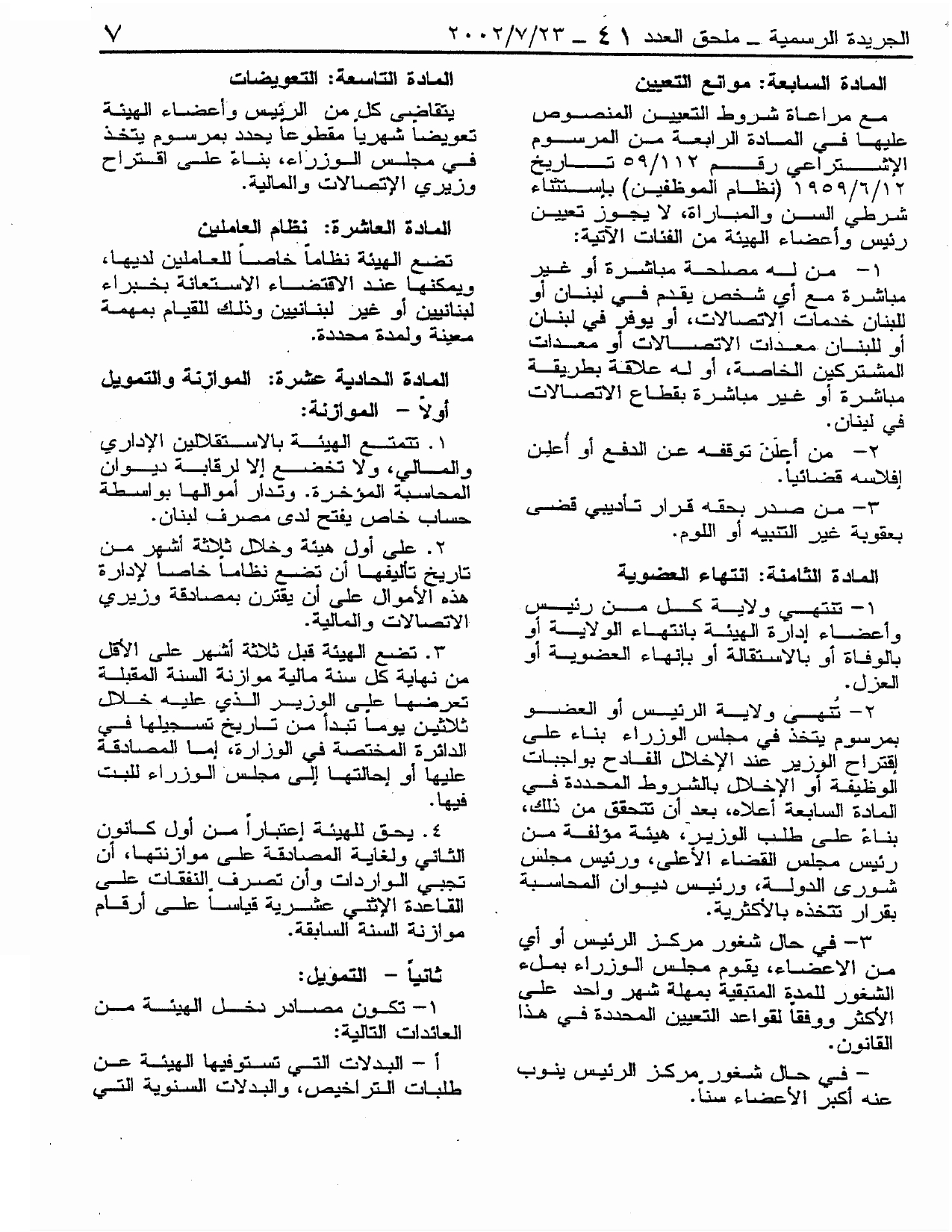 القانون 431 الذي ينصّ على إنشاء الهيئة ، التي انيط بها تحرير وتنظيم وتطوير قطاع الاتصالات في لبنان