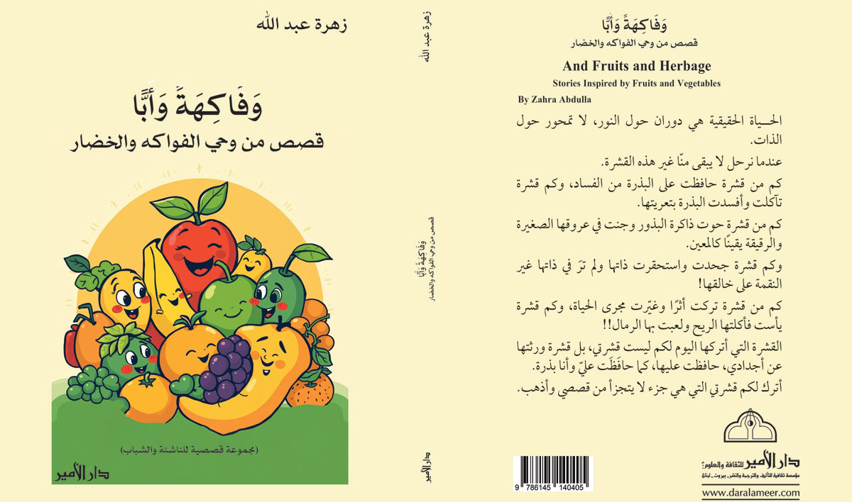 أصدرت دار الأمير في بيروت باكورة الأعمال الأدبية للكاتبة البحرينية زهرة عبد الله، بعنوان “وفاكهةً وأبًّا – قصص من وحي الفاكهة والخضار، وذلك ضمن سلسلة إصداراتها للموسم الثاني من عام 2025.