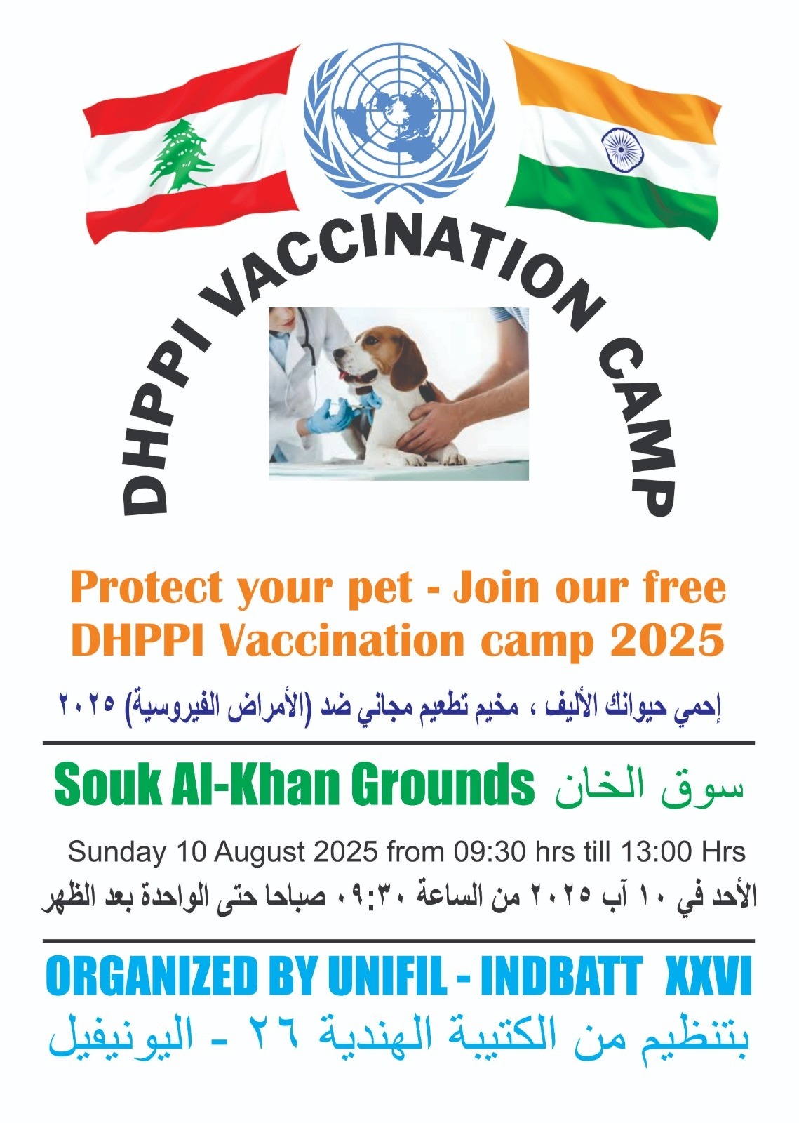 تحت عنوان: «احمِ حيوانك الأليف – شارك في مخيم التطعيم المجاني 2025»، تنظّم الكتيبة الهندية 26 العاملة ضمن قوات الطوارئ الدولية (اليونيفيل) مخيمًا مجانيًا لتطعيم الحيوانات الأليفة، يهدف إلى تعزيز صحتها والوقاية من عدد من الأمراض الفيروسية الشائعة، وذلك من خلال تقديم اللقاحات الضرورية مجانًا لجميع المشاركين.