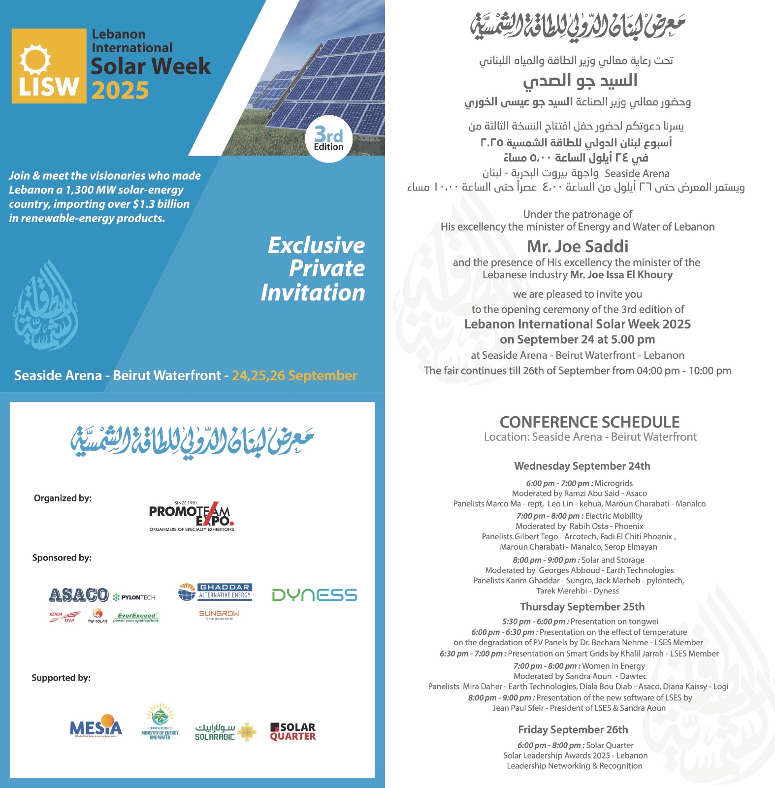 يقام المعرض برعاية معالي وزير الطاقة والمياه السيد جو صدي، وبحضور وزير الصناعة السيد جوزيف إسحاق الخوري، ليجمع تحت سقف واحد نخبة من الخبراء والرواد والشركات العالمية والمحلية، الذين أسهموا في جعل لبنان أحد أبرز الدول النامية في مجال الطاقة الشمسية، بطاقة إنتاجية تقدَّر بـ 1300 ميغاواط، وحجم استيراد يتجاوز 1.3 مليار دولار من منتجات الطاقة المتجددة.