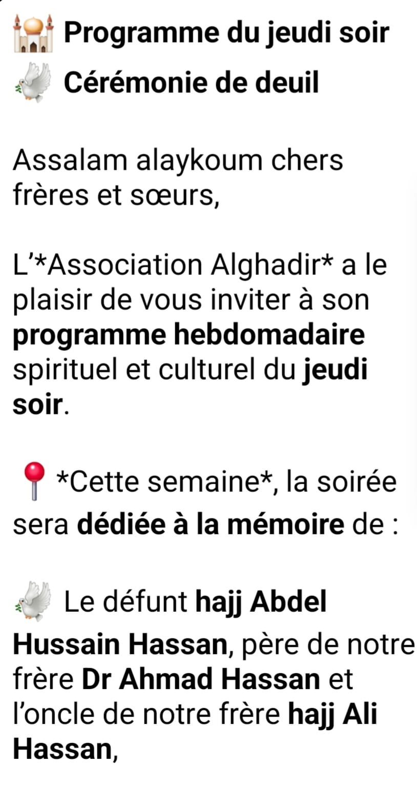 دعت جمعية الغدير (باريس - فرنسا) لحضور البرنامج الأسبوعي العبادي والثقافي لليلة الجمعة، والذي يُخصَّص هذا الأسبوع لإحياء ذكرى أربعين