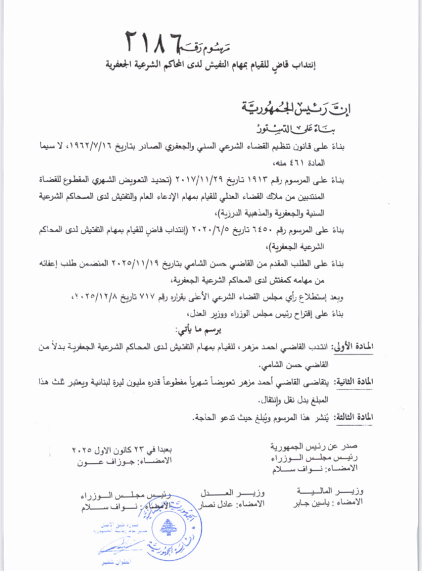 وبناءً على المرسوم رقم 6450 تاريخ 5/6/2020 (انتداب قاضٍ للقيام بمهام التفتيش لدى المحاكم الشرعية الجعفرية)،