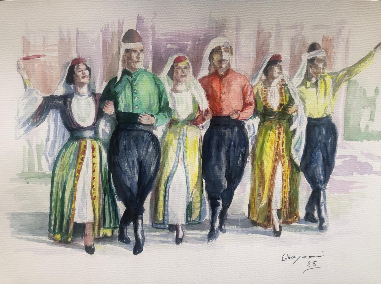 لا تقدّم أعمال غزاوي قراءة دلالية نوستالجية مباشرة للماضي، بل تقترح مقاربة تأملية للتراث بوصفه كياناً حياً. إذ يمكن النظر إلى هذه التجربة بوصفها محاولة لإعادة تعريف العلاقة بين الفن والذاكرة الجماعية. اللوحات لا تستعيد الحدث، بل أثره؛ لا تعيد تمثيل الطقس، بل الإحساس المرتبط به. هذا التحول من التمثيل إلى التأويل هو ما يمنح هذه الأعمال قيمتها المعاصرة . أما أسلوبياً ، يمكن تصنيف هذه الأعمال ضمن منطقة وسطى بين التعبيرية والانطباعية الإيحائية، مع حضور واضح للبعد الرمزي. لا تسعى اللوحات إلى نقل المشهد كما هو، بل إلى إعادة صياغته وفق رؤية ذاتية واعية. الملامح الوجوه غالباً مختزلة، لا تُعنى بالتفاصيل الدقيقة، بل تكتفي بإشارات كافية لتحديد الحالة. هذا الاختزال لا ينتقص من قوة التعبير، بل يمنح المتلقي مساحة للتأويل، ويبعد العمل عن التقريرية فالزي التقليدي يحتل موقعاً مركزياً في التكوين، لكنه لا يُقدَّم كعنصر زخرفي. الأقمشة، الأحزمة، وأغطية الرأس تُرسم بوصفها امتداداً للجسد،. حركة القماش في رسوماته تُضخَّم بصرياً بنعومة، فتبدو أكثر سيولة من الجسد نفسه، ما يعكس دور الزي كحامل للهوية ووسيط بين الفرد والجماعة. هذا التوظيف يعيد الاعتبار للملبس بوصفه عنصراً ثقافياً فاعلًا، لا مجرد تفصيل شكلي. فهل العلاقة بين الشكل والمضمون تتسم بالانسجام؟ أم الخيارات التقنية والأسلوبية تخدم الفكرة العامة للعمل، ولا تبدو مفروضة من الخارج.؟ وهل الخلفية تعمل كحقل لوني محايد يسمح بتركيز الانتباه على الحركة والعلاقات بين الأجساد، دون تشتيت بصري.؟