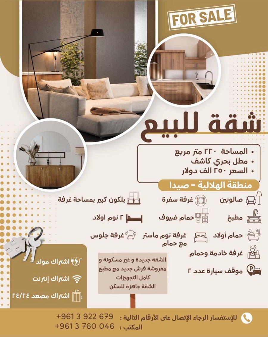 معروض للبيع شقة مفروشة في منطقة الهلالية - صيدا كؤلفة من صالونين وغرفة سفرة وبلكون كبير بمساحة غرفة ومطبخ وحمام ضيوف و٢ نوم اولاد و حمام مشترك وغرفة نوم ماستر من ضمنها حمام وغرفة جلوس للعائلة وغرفة خادمة و حمام خادمة وموقف سيارة عدد ٢