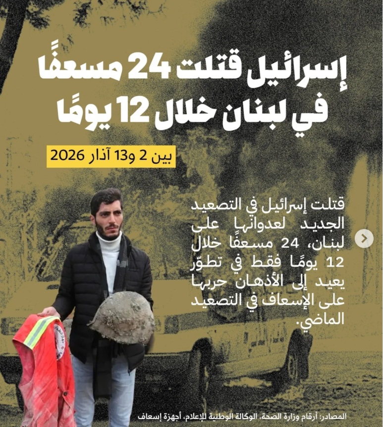 ٢٤ مسعفاً شهيداً خلال ١٢ يوماً آخرهم ٤ اليوم وقبلهم عشرات…