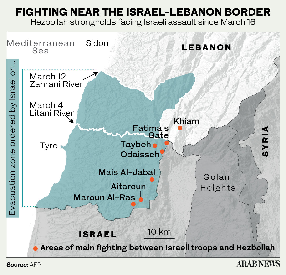 وقال إن الشريط الذي تحاول إسرائيل إقامته "يمتد بطول 80 كيلومتراً من الناقورة على الساحل إلى مزارع شبعا شرقاً، ويضم 57 قرية وبلدة" - ذات أغلبية شيعية، إلى جانب طوائف مسيحية ودرزية وسنية.