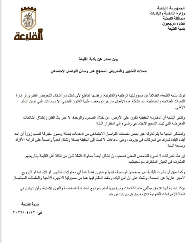 وأكدت بلدية القليعة التزامها بموقفها الرافض لأي شكل من أشكال التشهير أو نشر الأخبار الكاذبة، لافتةً إلى أن حفظ الأمن والنظام في البلدة هو من مسؤولية الأجهزة الأمنية والسلطات المختصة وأنها لن تتهاون في اتخاذ الإجراءات القانونية بحق المخالفين..