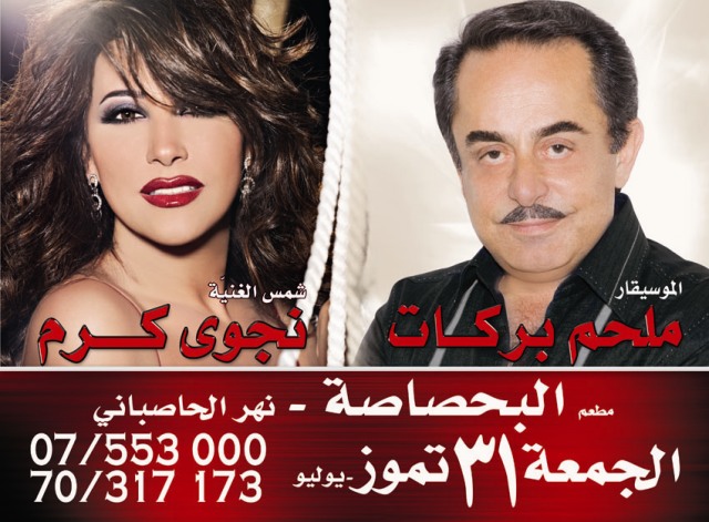 اللقاء المنتظر مع الموسيقار ملحم بركات وشمس الاغنية اللبنانية نجوى كرم سنعيش لحظاته في ليلة من العمر على الحاصباني في مطعم البحصاصة في 31 تموز 2009